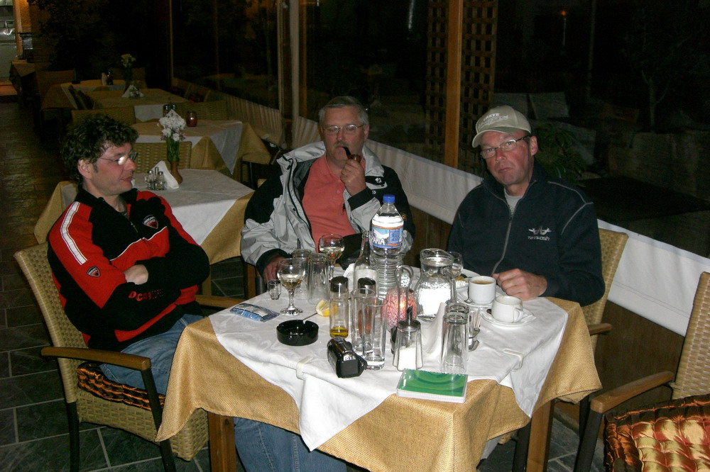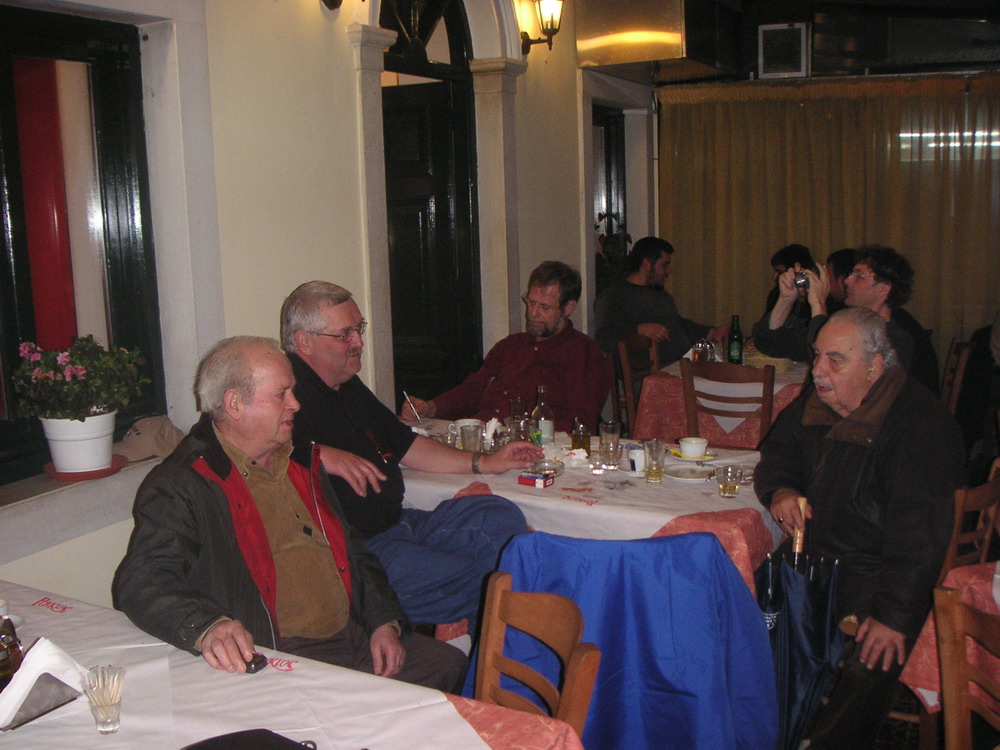 Nach kurzer Verschnaufpause laufen wir in die nächste Kneipe. Sieht etwas nach Pommes-Bude aus, hat aber einen sehr netten Gastwirt, das Essen ist Prima, der Wein auch. Unsere griechischen Tischnachbarn sind sehr gesprächig und wir unterhalten uns angenehm. Deutsch wird dem englisch bevorzugt. Wir haben viel Spaß, alles wirkt sehr familiär und gastfreundschaftlich. Eigentlich wollten wir schnell ins Bett aber es wird dann doch 12:00.