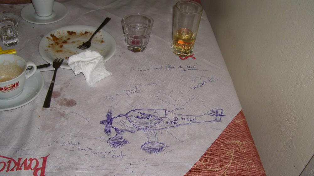 Der Tag beginnt mit Sonnenschein, es sieht gut aus. Nach kurzem Frühstück geht es zum Flugplatz. Die Bürokratie wächst sich aus, bis wir endlich in der Kiste sitzen. Eine Passagiegebühr wird fällig, Gerade mal 18 € für einen Rundflug neben der Landegebühr nebst Handling. Unser Slot nach Mostar wird beantragt und ein entsprechender Flugplan aufgegeben. Nach dem Start gibt es plötzlich Meldepunkte die niemand kennt und die auch nicht veröffentlicht sind. Aber trotzdem fliegen wir weiter bis wir erfahren dass Mostar heute geschlossen ist. Dafür handele ich mir noch einen Einlauf von der Luftaufsicht ein, weil ich unerlaubt in die CTR von Sarajevo einfliege. Später geht es zu einem Aussichtskaffee auf dem Berg. Es ist wirklich beeindruckend, wie diese Stadt aussieht. Am Abend versuchen wir noch einmal Spritt zu bunkern. Der Amtsschimmel wiehert besser als in Deutschland. Der Tankvorgang dauert 3 Std. Alleine auf weiter Flur binde ich im strömenden Regen noch den Flieger vom Ernst fest. Er hatte vergessen seine Haken einzuschrauben, daher konnte das Ground-Handling Personal den Flieger nicht festbinden.