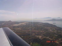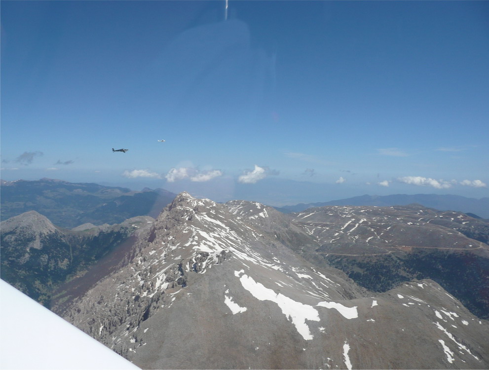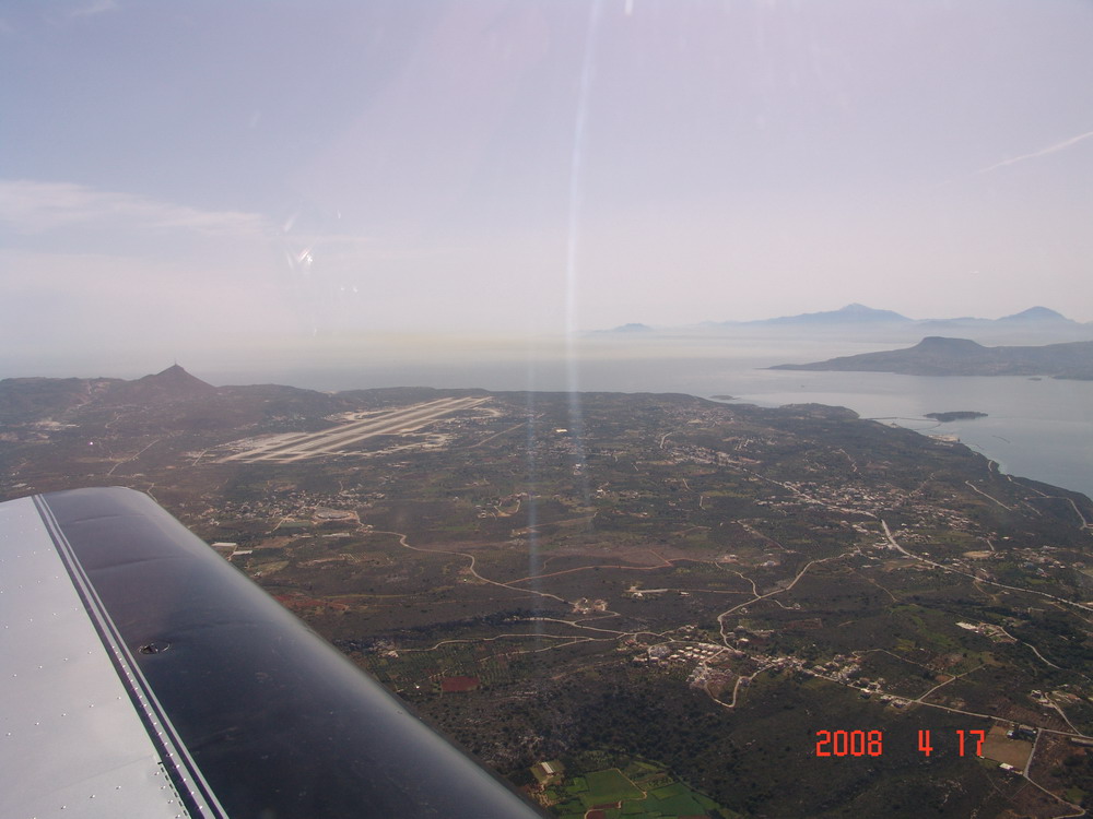 Jetzt muss nur noch der Tankwagen kommen. Mit einem Formationsstart verabschieden wir uns von Kerkira. Georges hat den Funk übernommen und macht die Nr. 1. Schöner Flug entlang der Küste, dann auf 10.000 ft steigen, die Berge sind wirklich so hoch, wie in der Karte angezeigt. In`s Tal zum Ikaros Airfild, gerade mal 1,5 Std. Flugzeit. Schöner Platz, mit allem was der Flieger braucht. Leider gibt es kein Essen. Wir planen den Weiterflug, jetzt gibt der PC von Ernst seinen Geist auf. Der Flugplatzbesitzer ist sehr hilfsbereit und freundlich, wir erhalten viele Tipps für unsere Streckenplanung. So wie wir das gedacht haben geht es nicht. Hier wird nur auf IFR Routen geflogen. Privatfliegen ist ein kleines Baby in Griechenland erfahren wir vom Platzbesitzer. Pünktlich um 15:00 UTC heben wir genau nach Flugplan ab. Außer der Ernst, der landet sofort wieder. Beim Start ging die Tür auf und seine Ausrüstung flog auf die Landebahn. Wir kreisen 5 Minuten über dem Platz, dann geht es weiter. Der Wind steht schlechter, die Sicht ist diesig aber immer noch brauchbar. Vorbei an Athen und Korinth.