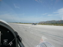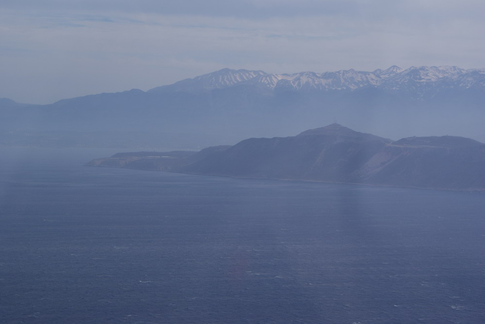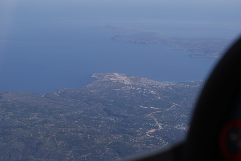 Über Funk höre ich zum ersten Mal den Konrad, er fliegt ca 100 km hinter uns. Schon bald können wir die schneebedeckten Berge von Kreta erkennen. Es sind lt. GPS noch 100 km. Das Meer hat kleine Schaumkronen, die Luft ist gleichmäßig ruhig, der Wind nimmt jedoch zu. Die Landung in perfekter Formation klappt wie gewohnt obwohl der Controller uns für Hubschrauber hält. Na ja bei 80 km Gegenwind ist die GS von 120 km/h kein Wunder.